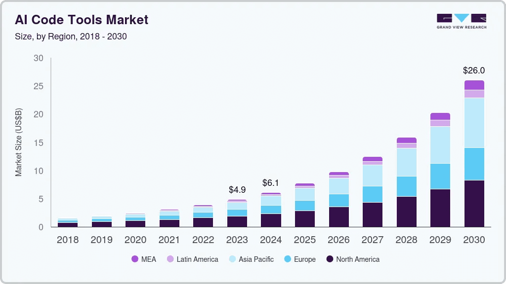 AI Code Tools Market Size by Region (2018 - 2030) according to GVR.